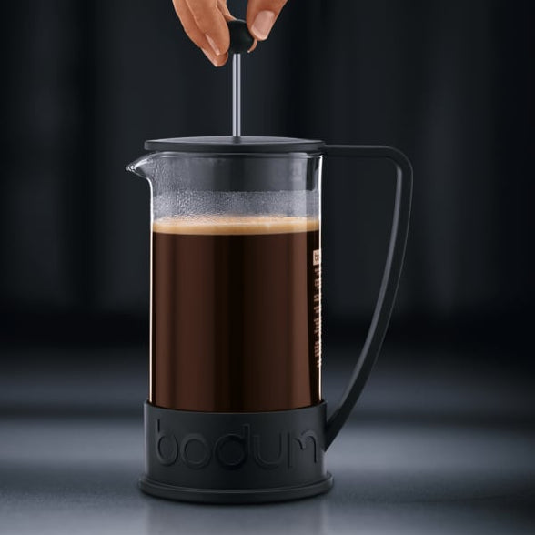 BODUM's first coffee maker, the BRAZIL was originally designed in the 1980s and offers attractive and functional design at an affordable price. Built with a heat resistant, borosilicate glass beaker and polypropylene handle and base. The domed lid is made of smooth polypropylene and includes the special Bodum safety and aroma seal to keep coffee warm for a long time. Just add coarse ground coffee, hot water and press Product Features • Brand: Bodum • Range: Brazil • Body material: heat-resistant borosilicate glass • Handle, lid and base material: polypropylene • Filter material: stainless steel • Filter lifespan: Permanent • Colour: black • Size: 3-cup • Capacity: 12oz • Capacity: 350ml • Also available: 8-cup • Also available: red