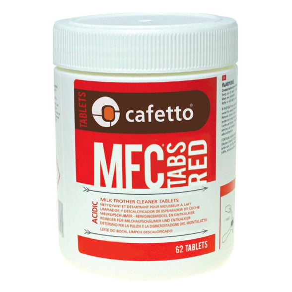 Acidic Milk System Cleaning Tablets MFC® Tabs Red is a high performance descaling and cleaning powder suitable for cleaning milk lines, frothers and parts of automatic espresso machines. Ideal for cold regions where freezing is an issue. Each clean requires only one tablet. Non corrosive formulation that is safe for all espresso machine and coffee brewing equipment parts. Directions TO CLEAN MILK LINES AND FROTHERS 1. Flush out milk system with 500ml of fresh water. 2. Add 1 tablet to 500ml warm water (75˚C) in a container or jug. 3. Stir until tablet is completely dissolved. 4. Flush the entire solution through the milk system following the machine manufacturer’s cleaning instructions. 5. Once the solution is dispensed, rinse the container. Fill the container with 1 Litre of clean water and flush through the milk system to thoroughly rinse. TO CLEAN MILK SYSTEM MACHINE PARTS 1. Add 1 tablet per 500ml of warm water (75˚C) in a container. 2. Stir until tablet is completely dissolved. 3. Add parts to be cleaned and allow to soak for 30 minutes. 4. Rinse thoroughly in clean water and dry with paper towel or clean cloth. Recommended For Weekly use for hard water conditions.