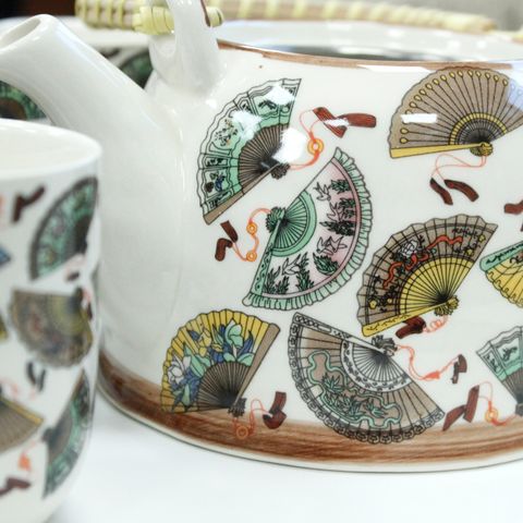 Packed in a gift box, a teapot with a metal strainer in the lid and six matching cups.